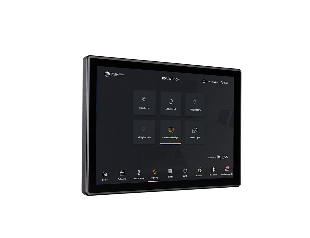 IBSS extends digital room controls to in-room tablet applications, providing a dedicated interface for shared spaces such as meeting rooms. Occupants can adjust lighting, temperature, blinds, and other settings directly from the tablet, without relying on personal devices. Tablet-based controls support a consistent experience across shared environments while enabling facilities teams to centrally manage and standardise control behaviour.